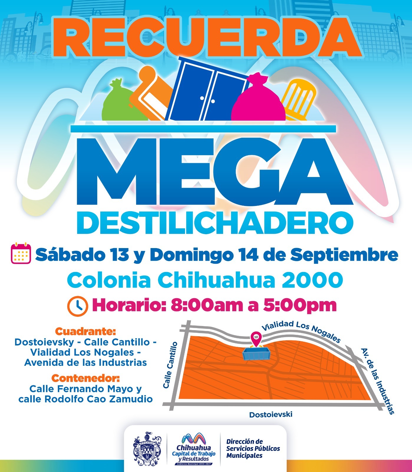 H. Ciudad de Chihuahua, Chih., a 11 de septiembre de 2025.- Con el objetivo de evitar acumulación de tiliches en la vía pública, así como en las viviendas, el Gobierno Municipal, a través de la Dirección de Servicios Públicos Municipales, invita a la ciudadanía y vecinos de la colonia Chihuahua 2000 a hacer uso del Mega Destilichadero mismo que permanecerá este sábado 13 y domingo 14 de septiembre en un horario de 8:00 am a 5:00 pm.