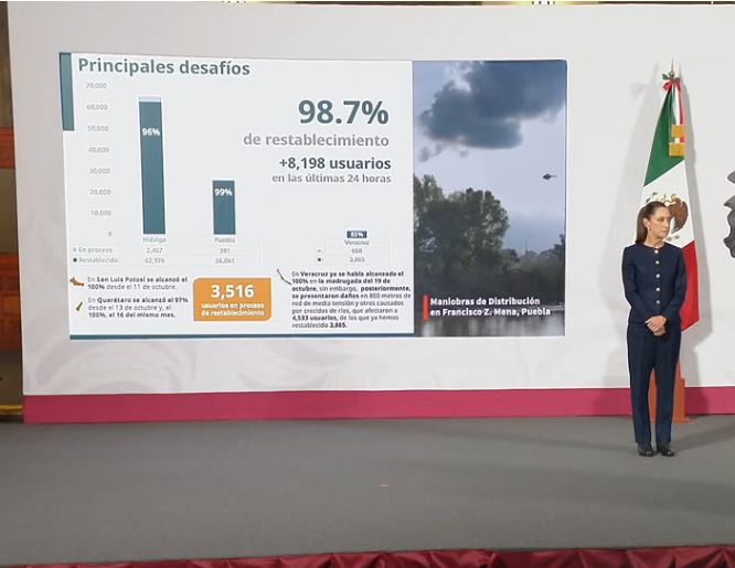 La titular de la Comisión Federal de Electricidad (CFE), Emilia Calleja, informó que registran un 98.7 por ciento en el restablecimiento del servicio, en zonas afectadas en cinco estados por las intensas lluvias a más de 10 días.