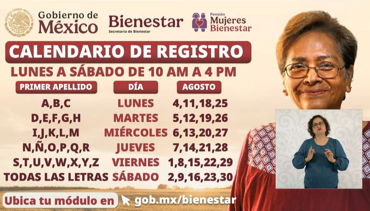 La secretaria del Bienestar, Ariadna Montiel, detalló que el registro para la Pensión Mujeres Bienestar será del 1 al 30 de agosto. A través de la página del Bienestar se consultan los módulos para hacer la inscripción.