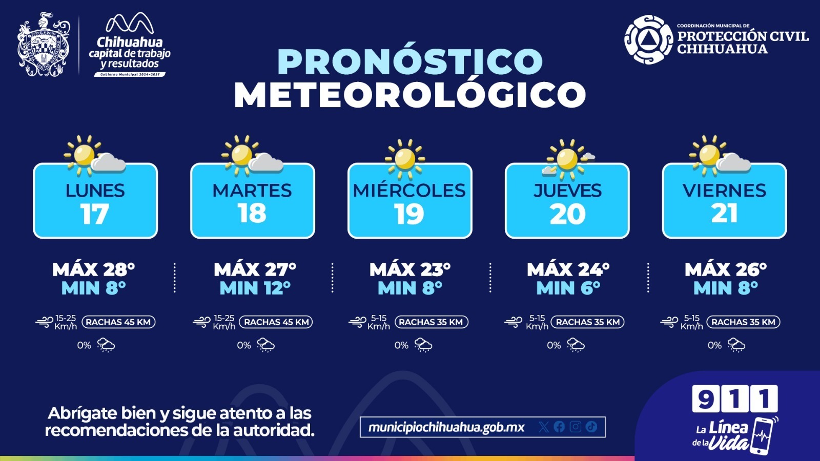 Chihuahua.-La Coordinación de Protección Civil Municipal informa que para esta semana se pronostican temperaturas máximas de hasta 28°C con mínimas de 8°C, además, para este lunes y martes se registrarán vientos ligeros de 15 a 25 kilómetros por hora, con rachas de hasta 45 km/h.