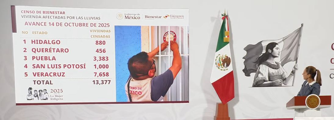 Al 14 de octubre se han censado 13 mil 377 viviendas afectadas por las lluvias, informó la presidenta de México, Claudia Sheinbaum.