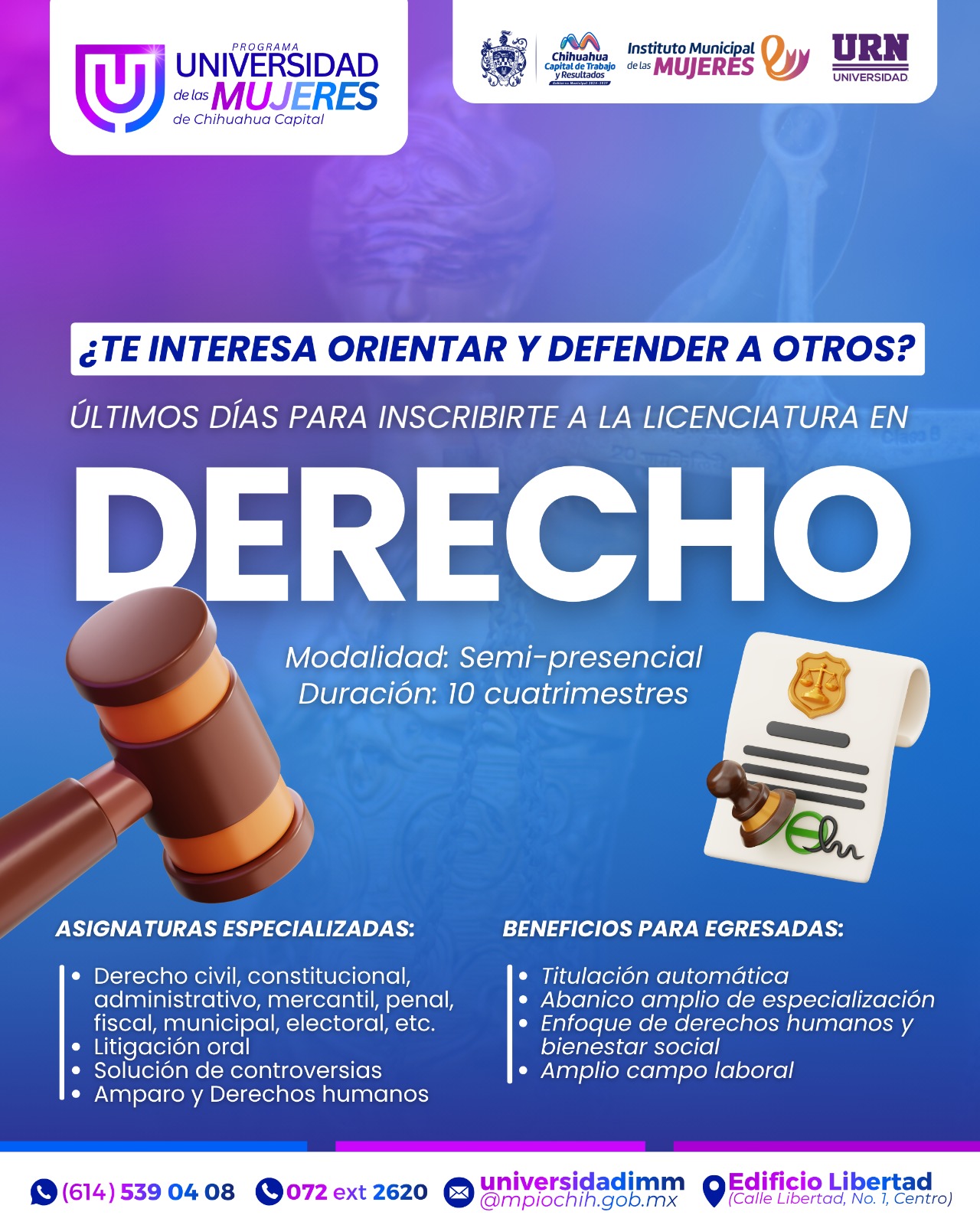 *_H. Ciudad de Chihuahua, Chih., a 21 de abril de 2026_*.– Porque el acceso a la justicia también se construye desde la educación, el Gobierno Municipal de Chihuahua, a través del Instituto Municipal de las Mujeres (IMM), invita a las mujeres a formar parte de la Licenciatura en Derecho en la Universidad de las Mujeres.